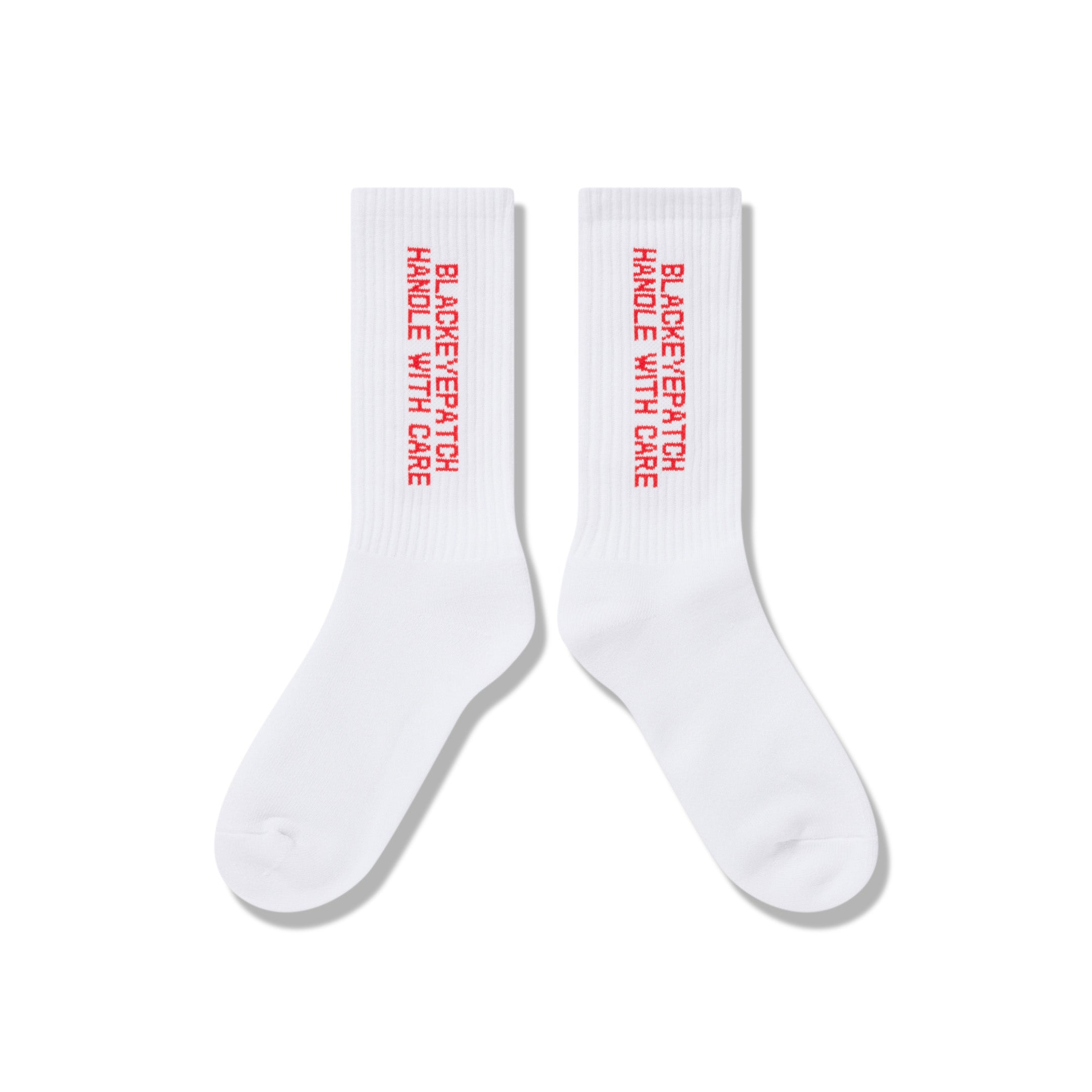 Socks featuring the standard “Handle With Care” graphic woven into them.
