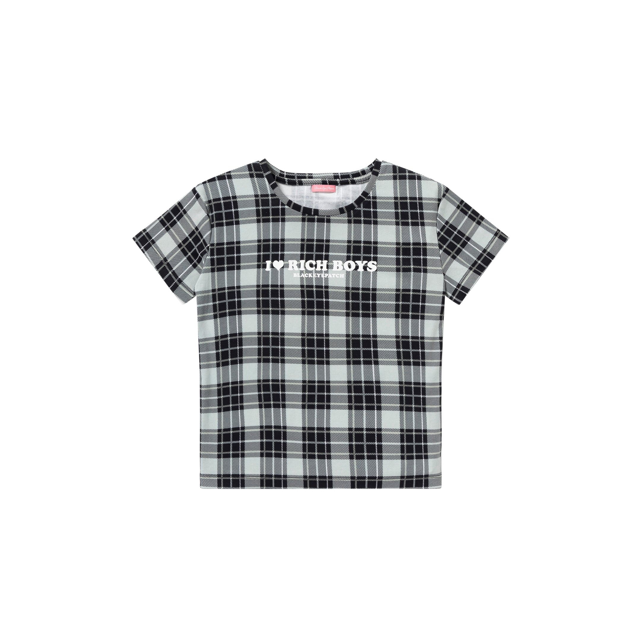 チェックの生地に「I♡RICH BOYS」をプリントしたTシャツ。
